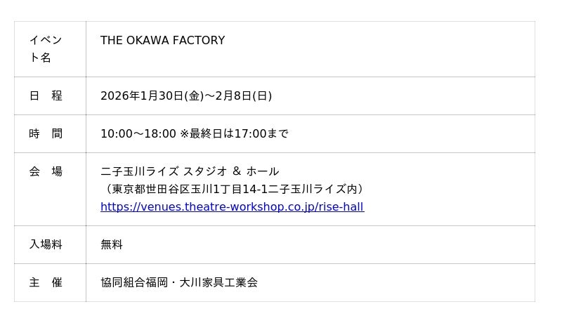 家具・木工の産地福岡県大川市を五感で感じる展示イベント『THE OKAWA FACTORY』が2026年1月30日(金)~2月8日(日)に二子玉川ライズ スタジオ & ホールにて開催。