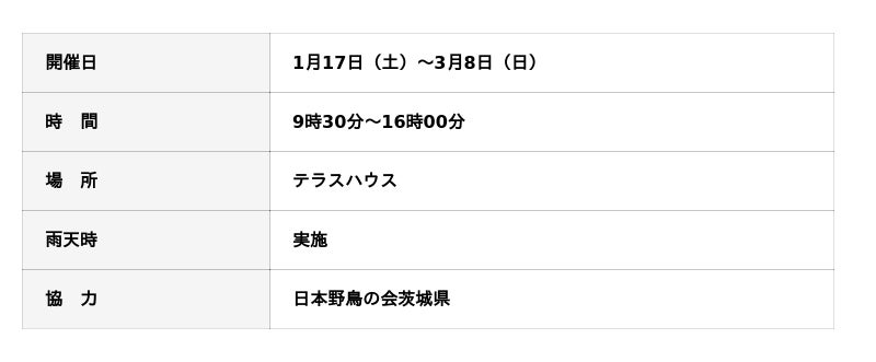 本イベントは、野鳥観察初心者でも楽しめるをテーマとした初開催の展示企画です。茨城県内および園内で観察できる、鳥たちの写真を展示した野鳥写真コーナーをはじめ、野鳥観察のはじめ方や、コアジサシの保護活動を紹介するパネル展示を行います。