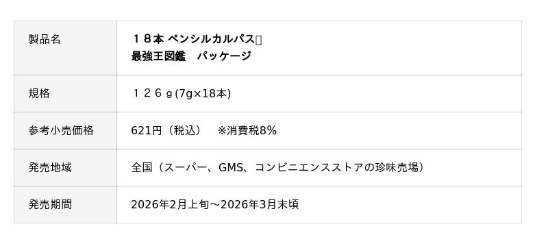 株式会社なとり(本社:東京都北区、会長兼社長:名取三郎)は、「18本 ペンシルカルパス(R) 最強王図鑑コラボパッケージ」を2月上旬より期間限定で新たに発売いたします。