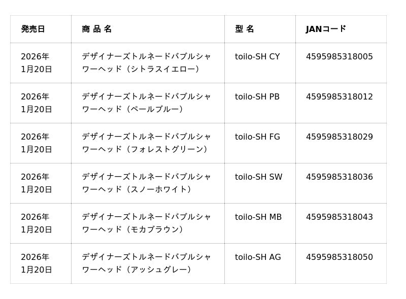 スズモト株式会社(本社:山形県鶴岡市、代表取締役社長:百瀬 浩、以下スズモト)は、全て樹脂部品による旋回技術で微細な泡を発生させる 「toILO(トイロ)シャワーヘッド」 を、2026年1月20日より公式オンラインストアで発売します。全工程を国内自社工場で行うことで高い水準の品質管理体制を構築。高い洗浄力と約50%*の節水性能を両立しつつ、6色のアースカラーでバスルームのインテリア性も高めました。
