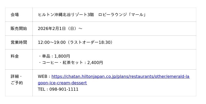 【2026年1月20日】ヒルトン沖縄北谷リゾート(北谷町(ちゃたんちょう)美浜(みはま) 統括総支配人 宍倉(ししくら)裕(ゆたか))は、ロビーラウンジ「マール」にて、新作スイーツ『エメラルドラグーン~幸せを運ぶカメの休息~』を2026年2月1日(日)より販売開始いたします。