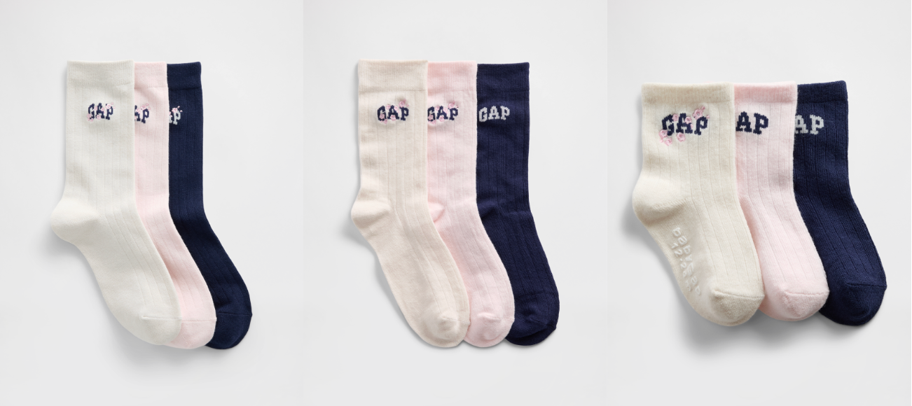 - ソックス 3足セット (Men’s 2,990円 / Boys 1,690円 / Toddler Boys 1,690円): GAPロゴと桜の刺繍が施された3点セットのリブソックス