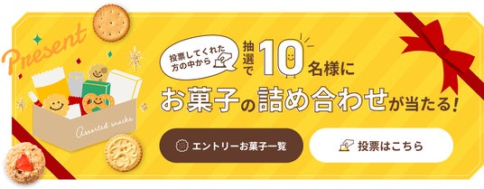 投票部門は、「オールスター部門」と「フォーカス部門」の2部門構成となっており、「オールスター部門」では「ベストオブビスケット」「ルックスデリシャス賞」「パッケージデザイン賞」の3賞を、「フォーカス部門」では「フレーバー賞」「ネクストブレイク賞」「からだにうれしい賞」の3賞を設けています。各部門のテーマに最もふさわしいと思うビスケットに投票いただき、投票にご参加いただいた方の中から抽選で10名様に、エントリービスケット32品の詰め合わせをプレゼントいたします。