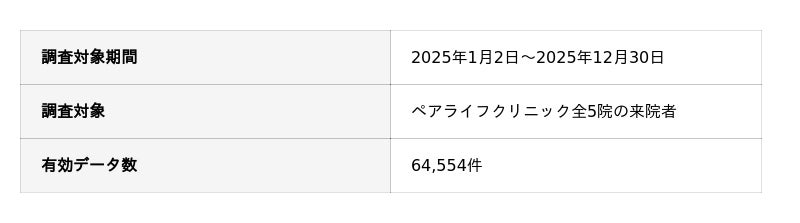 本調査は、ペアライフクリニック(全5院)における2025年の受診データに基づくものです。来院される患者様の属性や受診動機(予防意識の高さ等)は、一般的な医療機関や国内全体の統計データとは異なる可能性があります。あくまで当院を利用される患者様の傾向としてご覧ください。