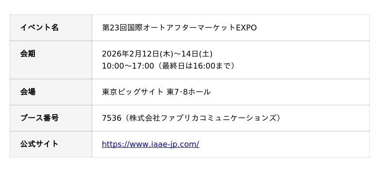 株式会社ファブリカホールディングス(本社:東京都港区、代表取締役社長CEO:谷口政人)の完全子会社、株式会社ファブリカコミュニケーションズ(本社:愛知県名古屋市中区、代表取締役社長CEO:谷口政人)は、2026年2月12日(木)から14日(土)まで東京ビッグサイト東7・8ホールで開催される「第23回国際オートアフターマーケットEXPO」に出展いたします。