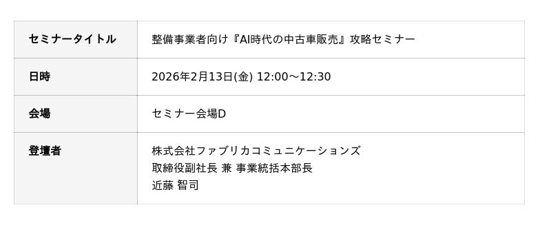 また、併催セミナーでは、AI時代の中古車販売における手法をご紹介します。「営業が苦手」「販売知識がない」といったお悩みを抱える事業者様でも、AIとデータを活用することで売上向上を支援する具体的な方法をお伝えする予定です。