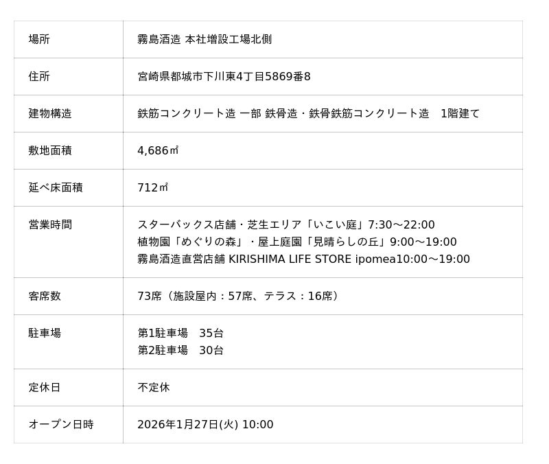 スターバックス コーヒー ジャパン 株式会社[本社所在地:東京都品川区、代表取締役最高経営責任者(CEO):森井久恵]と、霧島酒造株式会社[本社:宮崎県都城市、代表取締役社長:江夏邦威]は、都城の豊かな自然を楽しみ、人々が集い、憩う施設、「KIRISHIMA GREENSHIP icoia(キリシマ グリーンシップ イコイア)」を2026年1月27日(火)に開業いたします。