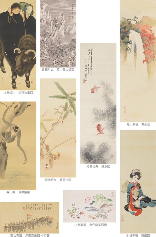本展では、小林一三が蒐集した日本画コレクションから作品を選び、当時の人たちが絵画を愛でた三つのシーンを再現してみました。その第一として、お座敷の床飾りに好まれた季節の風情を描く作品には、ご来客をおもてなしする優しい思いが知られます。そして第二に、詩歌などの文芸とともに楽しまれた文人画や俳画の作品には、文化を担った大阪人の心意気が覗われます。また第三には、茶会・宴会など人々が交遊する場を賑やかに盛り立てた作品からは、歓声や喝采が聞こえてくるようです。