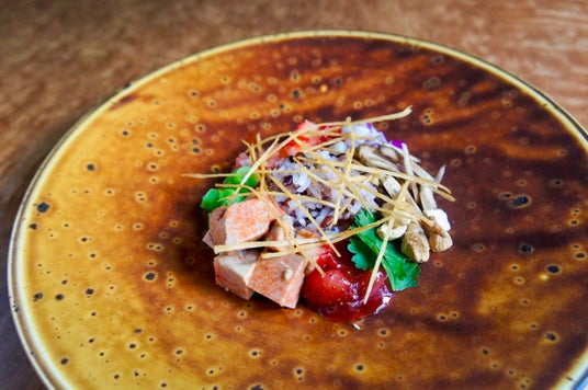 あん肝と苺、パクチーの相性を伊藤農園さんの古代米でまとめ上げたライスサラダ。