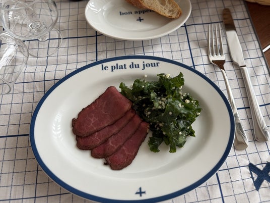 Lサイズのプレートにはローストビーフ。白地にブルーの縁取りが料理を引き立ててくれるデザイン。楽ティータイムにはSサイズにスイーツ、コーヒーはたっぷりとマグカップで・・・。