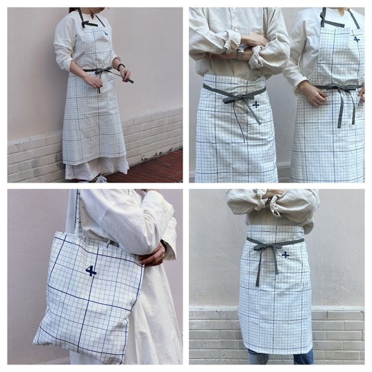 同素材のエプロンやバッグは、シンプルな縦横の格子柄により、清潔感あふれ凛とした美しさがあります。