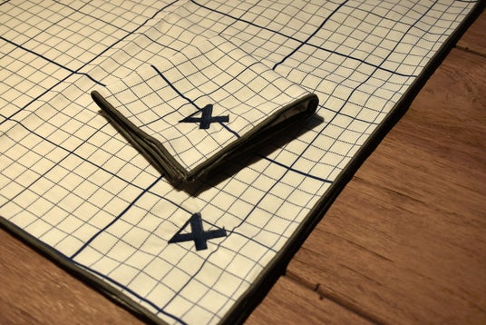 合わせるクロスは、パリのビストロで見かける定番の赤いギンガムチェックのテーブルクロスのような位置づけになればと思い、ブルーのグリッド(方眼)デザインで作りました。