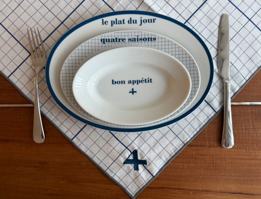 パリ キャトル・セゾンのオリジナルロゴの「ブルー」、家具カタログの「方眼デザイン」から着想