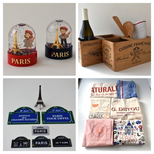 現地のスーパーマーケットのエコバッグ、現地でお土産物を生産しているメーカー、エッフェル塔やトワルドジュイ、おなじみのパリの道路標識といったアイコニックなデザインを取り入れたアイテム、眺めるたびにパリの思い出がよみがえってきそうなスノードームなど、全てフランスで販売しているモノばかりを集めました。
