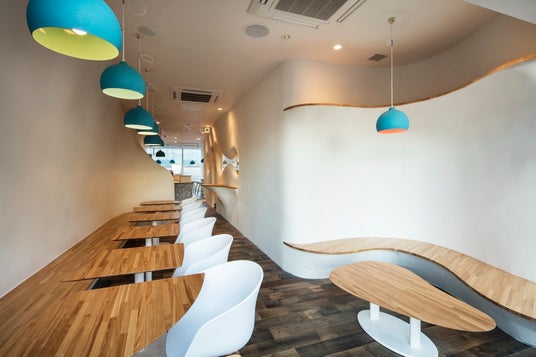 雲をイメージした流線形の壁や、温かみのある木製テーブル、テラス席を含め「自由さ」を感じさせる空間。現在「パンとエスプレッソと自由形」×「romi-unieコンフィチュール」POP-UPコラボ中です。