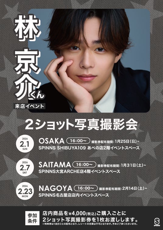 若者向けアパレル事業を中心に展開する、株式会社ヒューマンフォーラム(本社:京都市中京区 代表取締役会長:出路雅明)が運営する「SPINNS(スピンズ)」が『林 京介』のイベントを開催いたします。