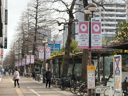 ・桃太郎大通りのフラッグが1ヶ月間フェスティバル仕様に