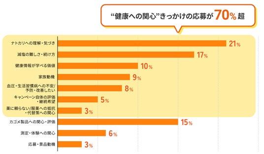 本キャンペーンに対するご感想として「自分の将来の体のために食事で整えたい」「健康について手軽にできる情報を知りたい」「キャンペーンをきっかけに減塩や血圧の事を気にかけて取り組もうとおもいました」といった、健康への関心をきっかけに応募したという声が70%を超えています。本キャンペーンが将来に対する高い健康意識を持つ層にリーチできたと考えられます。