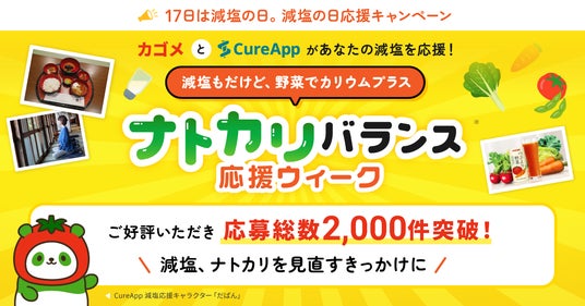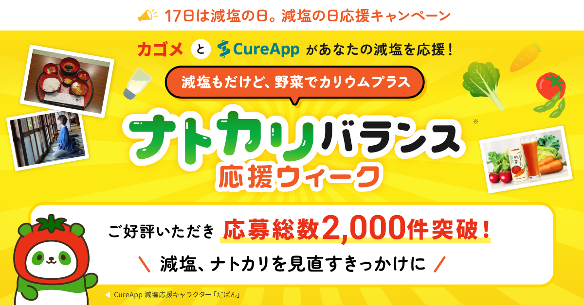 株式会社CureApp(キュア・アップ / 本社:東京都中央区 代表取締役社長:佐竹 晃太 以下、当社)は、2025年11月17日(月)~12月5日(金)の期間に実施した「減塩の日 応援キャンペーン(以下:本キャンペーン)」において、2,000件を超えるご応募をいただきました。また応募者さまから頂戴したアンケート結果から本キャンペーンの開催意義を考察しましたのでご報告いたします。