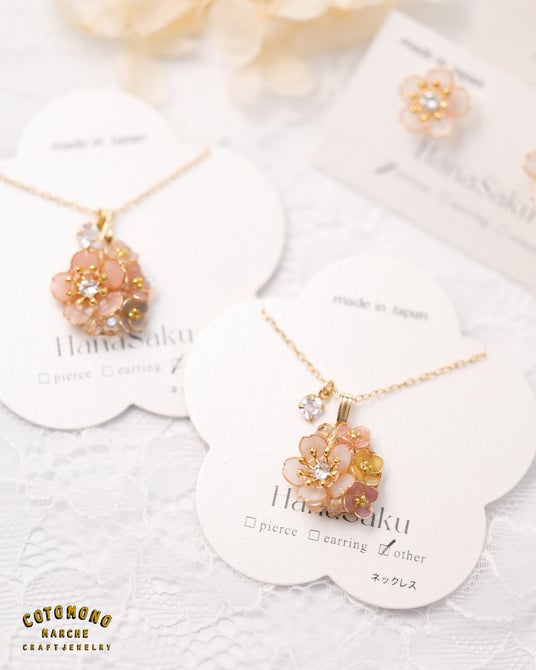 小さなお花のアクセサリーを提案するHanasakuさん。控えめにキラッと輝く中央のビジューと小粒の花々に女の子心をくすぐります。ピアスも一緒に展開しておりますので、ネックレスとお揃いでお楽しみいただけます。