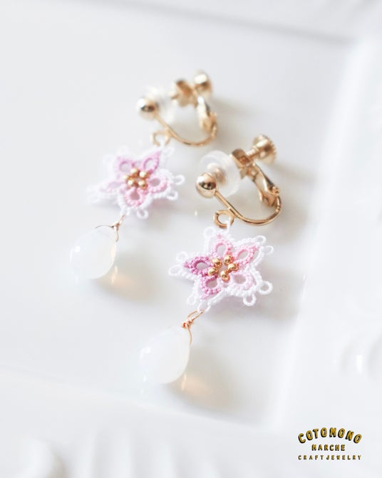 ■1本の糸からできる桜のモチーフはとっても繊細タンディングレースでさまざまなアクセサリーを作る にしきの さん。桜のモチーフの中央にはゴールドのビーズが5つ並びます。レースならではの繊細なデザイン、大人な女性にも楽しんでいただける桜アクセサリーです。