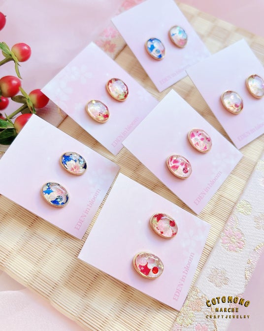 樹脂には本物のお花を閉じ込めているんです。5つセットのピアスはお洋服のように毎日組み合わせが変えられるのが楽しいですよ♪