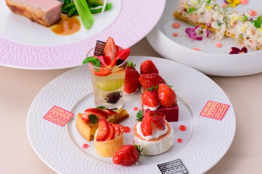 現在開催中のあまおうデザートビュッフェを付けた予約者に限り、人気のランチメニュー「ランチフォション」を5周年特別価格5,000円にてご提供いたします。「ランチフォション」は、アミューズからデザートまで全5品で構成され、選べるメイン料理やフォションシグネチャーデザート「ビズビズ」をミニサイズでお楽しみいただけます。見た目にも麗しく、滋味深い味わいでフォショングルメの世界へ誘ってくれるランチコースとして人気です。フォションホテル京都の人気ランチメニューの後には、可愛く、甘い、福岡県産の博多あまおうを用いたデザートの数々をご堪能ください。この時だけの特別価格で、料理とデザートを存分にお楽しみいただけるランチタイムをお過ごしいただけます。