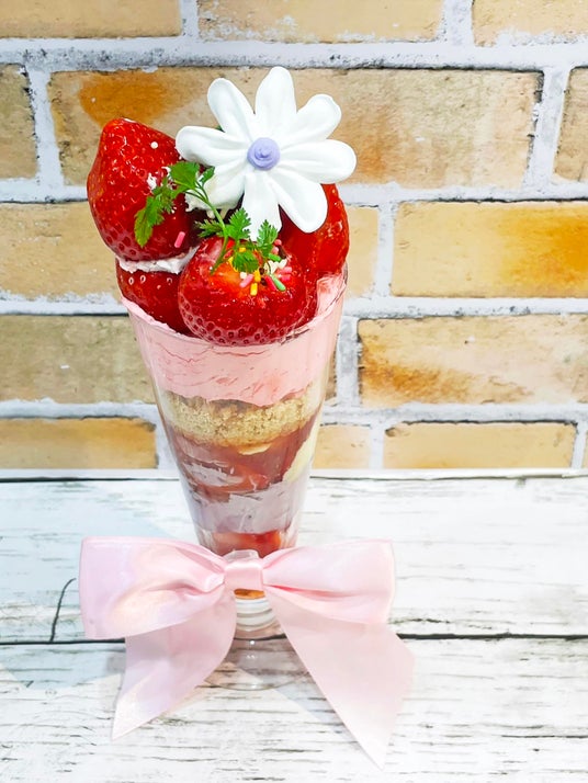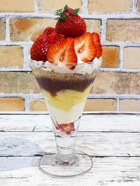 下からいちごの砂糖漬け、ヨーグルト、カスタードクリーム、いちごソース、砕いたクッキー、バニラアイス、生クリーム、いちご…と、層になった見た目の美しさも楽しめます。