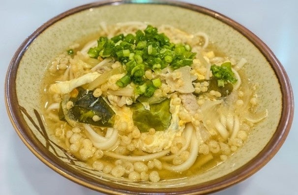 大豆で味わい深い出汁をとり、江田島の醤油で味付けした、香り豊かな、昔から江田島市で伝わる大豆うどんです。