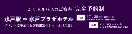 さらに、イベントの締めくくりにはご参加の皆さま全員にチャンスがある、ホテルレストランのご優待券などの豪華プレゼントが当たる抽選会を開催。水戸駅からのシャトルバスの運行もあり、お帰りの心配なくイベントの余韻を最後までご堪能いただけます。