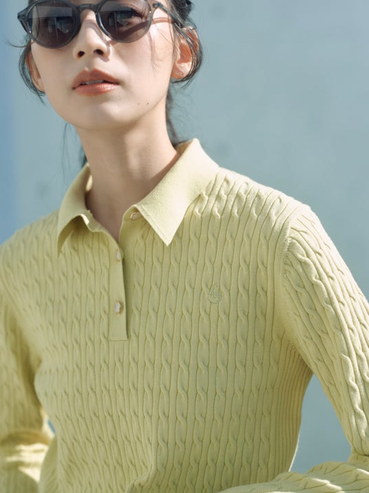 ケーブル編みの立体感と襟付きデザインが、知的なムードを加速させます。