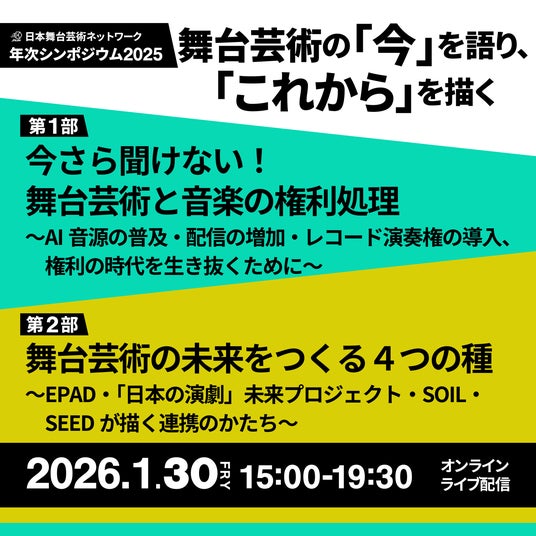 2025年度の年次シンポジウムは2部構成にて実施。第1部は、舞台芸術業界が直面する、文化庁・文化審議会において現在審議が進められている「レコード演奏権・伝達権」をテーマに、背景や現場への影響をわかりやすく解説します。第2部は、JPASNが推進する舞台映像のアーカイブ事業「EPAD(イーパッド)」、地域での上演機会の創出や舞台芸術業界への就職を支援する「日本の演劇」未来プロジェクト、日本の舞台芸術の国際展開を支援する育成プログラム「SOIL(ソイル)」、舞台芸術コンテンツの海外進出を担う人材を育成する産学官連携の教育・研究プログラム「SEED(シード)」の4つの業界横断事業を紹介します。