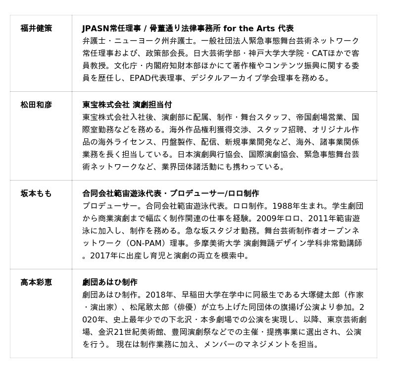2020年2月26日の政府による突然の自粛要請を受け、相次いで中止・延期となった舞台公演による損失の実態を把握すべく行った調査を契機に発足。ジャンルや団体規模を問わず、多種多様な舞台芸術関係者が参加する形で活動を開始し、2021年9月に法人化。現在では260の会員とともに、舞台芸術団体が持続的かつ力強く発展していけるための情報プラットフォームとして活動している。舞台芸術を取り巻くさまざまな課題に業界横断的に取り組み、その持続可能性と創造的発展を目指している。