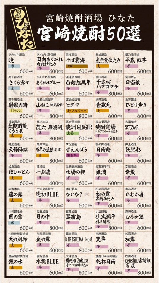 【焼酎出荷量 11年連続日本一!】宮崎県内「全38蔵」の本格焼酎が銀座に集結。期間限定の居酒屋『宮崎焼酎酒場ひなた』1月22日(木)オープン!
