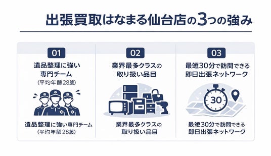 こうした地域課題に対応するため、「出張買取はなまる仙台店」は 高齢者支援・遺品整理・粗大ゴミ搬出のサポート体制 を強化した専門拠点として開設されました。