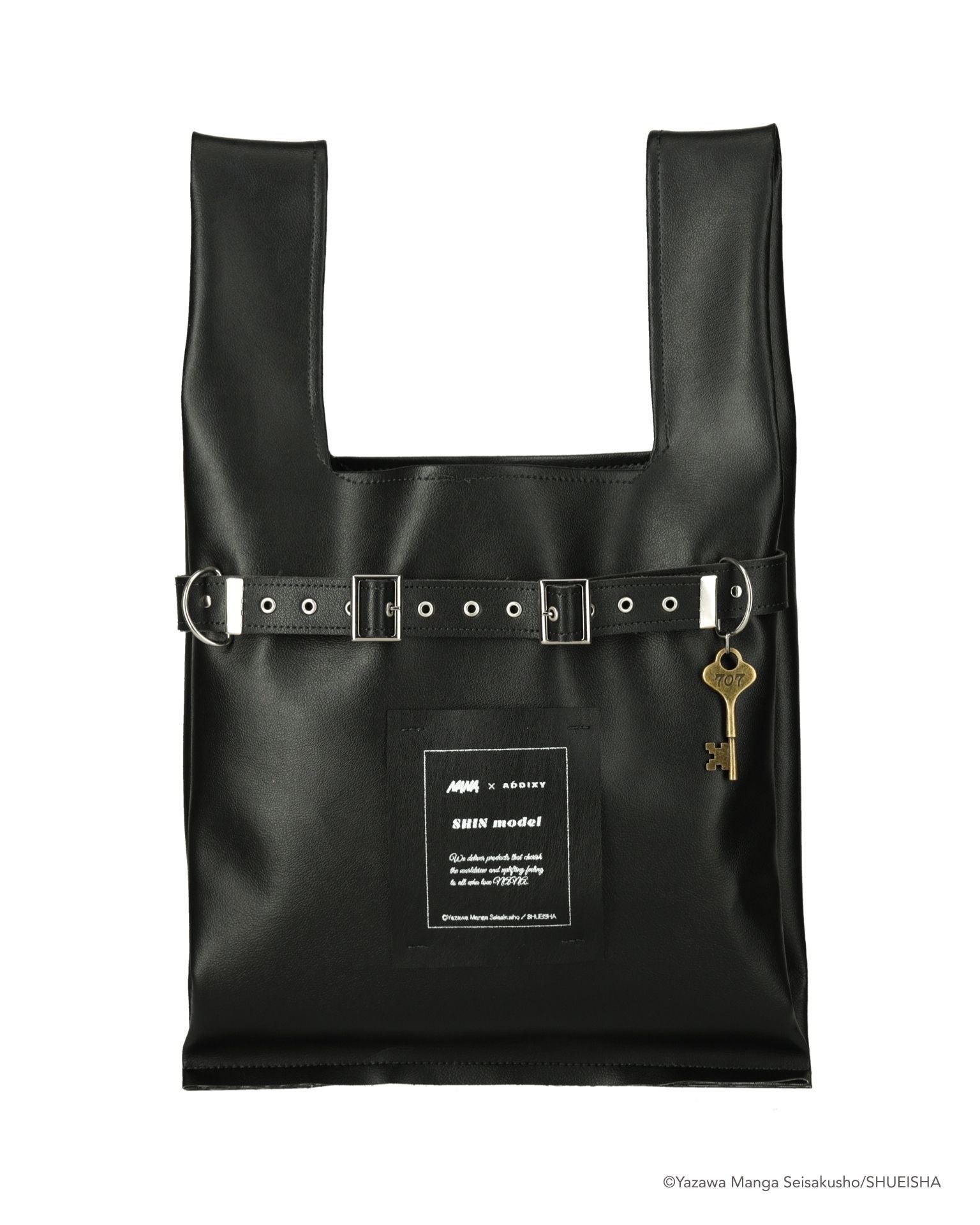 シンの佇まいやスタイルから着想を得てデザインした、エコレザー素材のバッグ。ミニマルなフォルムに、ADDIXYのアイコンの一つでもあるベルトディテールを取り入れ、ストイックさと日常性を併せ持つデザインに仕上げました。フロントには”shin model”と記したコラボレーションオリジナルラベルを配置。チャームとして「707号室」の鍵を、さりげないディテールとして取り入れています。日常的に使いやすいサイズ感と軽さで、スタイリングを選ばず取り入れられるアイテムです。