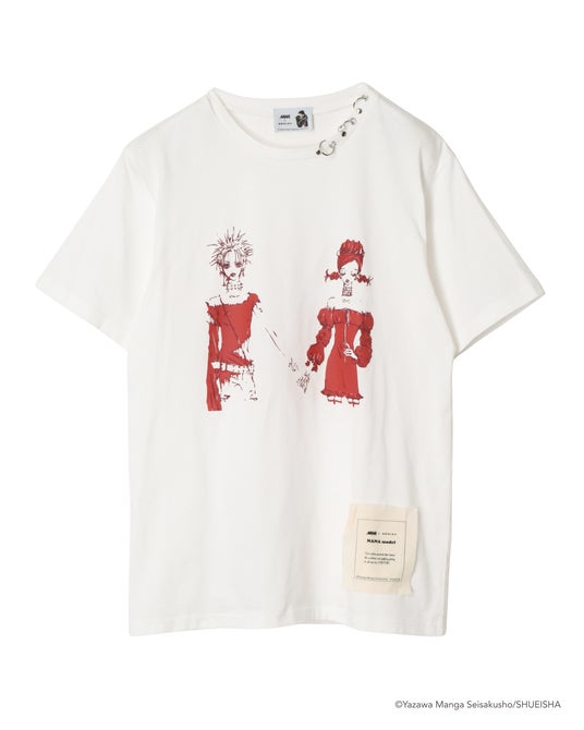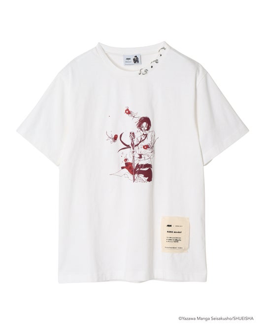 原作の印象的なシーンを切り取り、日常に取り入れやすいアートワークとして再構築したTシャツ。赤い線画を生かした立体感のあるプリントが、線画の細部まで、繊細に表現されたプリントです。ホワイトは赤の線画が際立つ印象に、グレーはモノトーンで落ち着いた雰囲気に仕上げた2色展開。襟元には、全体のバランスを引き締めるメタルパーツのディテールを配置。裾には “nana model” のオリジナル布タグをあしらい、シンプルなTシャツにさりげなく表情を加えています。プリントTシャツの枠を超て、ファッションアイテムとして成立する存在感を持つ一枚です。