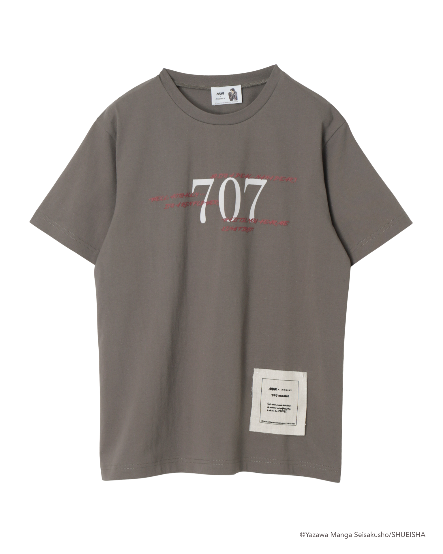 作品の象徴や余韻を、キャラクターの登場しない抽象的モチーフとして表現。フロント中央の「707」は、ナナとハチが暮らした707号室を象徴する数字。その周囲には、二人がこの部屋で交わした印象的な会話を散りばめました。裾にはADDIXYコラボレーションオリジナルのタグをあしらい日常のスタイリングにも溶け込むミニマルで洗練された表情に仕上げました。