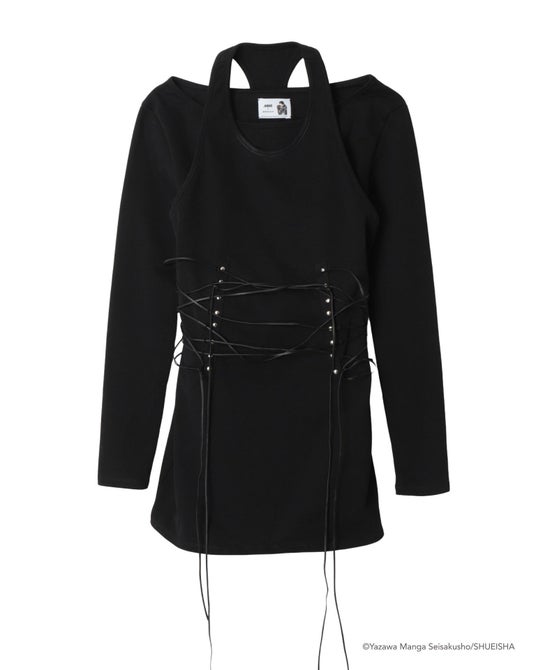 ナナのスタイルから着想を得てデザインした、レイヤード仕様のトップス。シンプルなブラックのボートネックロンTに、レザーコードのレースアップを施したタンクトップを重ね強さと緊張感のあるバランスを表現しています。レースアップはADDIXYのブランド初期から象徴的に用いてきたディテール。ナナがまとう意志の強さや揺るがなさを、構築的なラインとして現代的に落とし込みました。それぞれ単体でも着用可能なため、スタイリングや季節に合わせたアレンジも可能。シンプルでありながら、レイヤードすることでスタイルに芯を与える一着です。