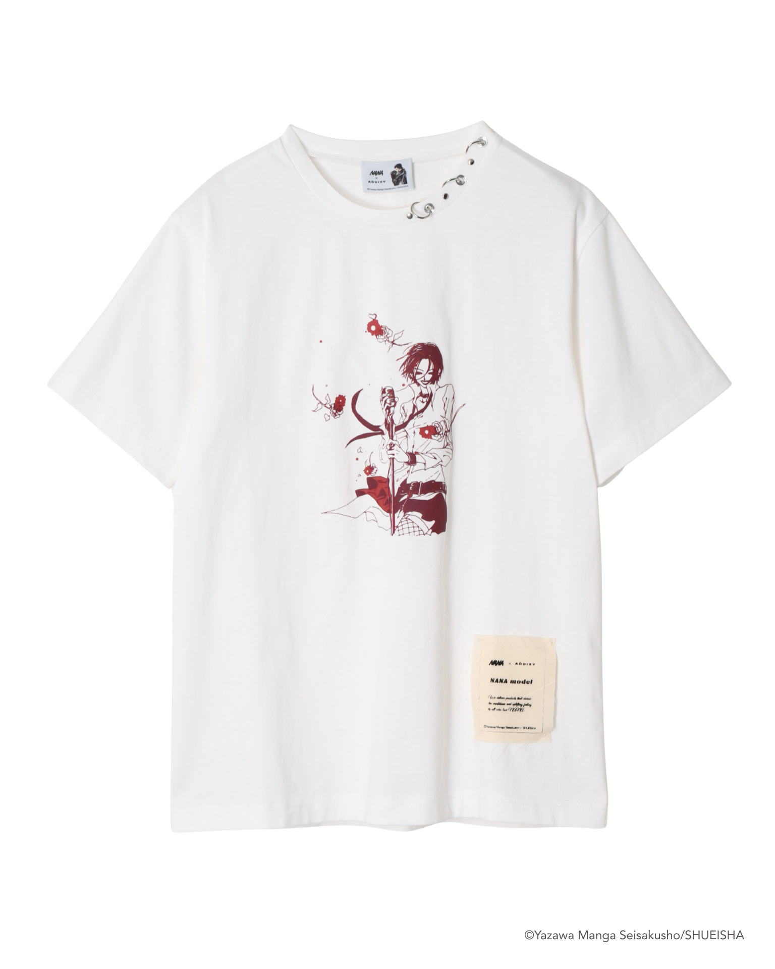 作中で描かれるライブシーンの空気感を切り取り、日常に取り入れやすいグラフィックとして再構築したTシャツ。ステージに立つナナの佇まいを、印象的な線画を用いたグラフィックで表現しています。ホワイトは赤い線画を際立たせ、ライブの熱量や感情の強さをダイレクトに感じられる一枚に。グレーは線画をモノトーンでまとめることで、熱を内に抱えたような静かなムードに仕上げました。線画の細部まで繊細に表現された立体的なプリントに加え、襟元にはスタイリングのアクセントとなるメタルパーツを配置。裾には “nana model” のオリジナル布タグをあしらい、シンプルな中にADDIXYらしいディテールを加えています。一枚で着ても存在感があり、ジャケットやシャツのインナーとしても映える、プリントTシャツの枠を超えた一着です。