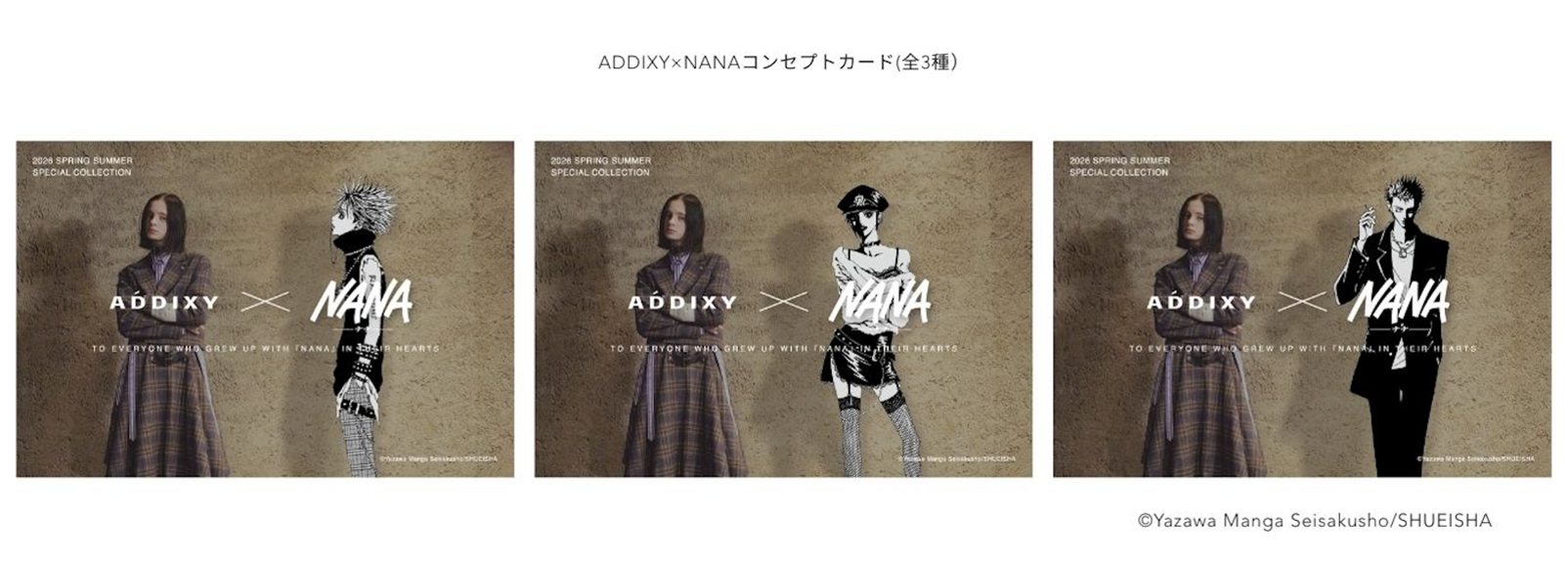 DDIXY株式会社(本社:東京都目黒区、代表取締役:堀内咲季、以下「ADDIXY」)が展開するアパレルブランド「ADDIXY」は、矢沢あい先生による大人気漫画『NANA』とコラボレーションしたファッションコレクションを、2026年2月6日(金)より特別LPにて予約販売いたします。この度、未発表のコレクション含め、全商品のラインナップを発表。また、本コラボレーションを記念し、東京(2月6日(金)~15日(日)/KATA at LIQUIDROOM内)・大阪(2月21日(土)~23日(月)/ATELIER ECRU内)の2都市にて期間限定のポップアップストアをオープンいたします。