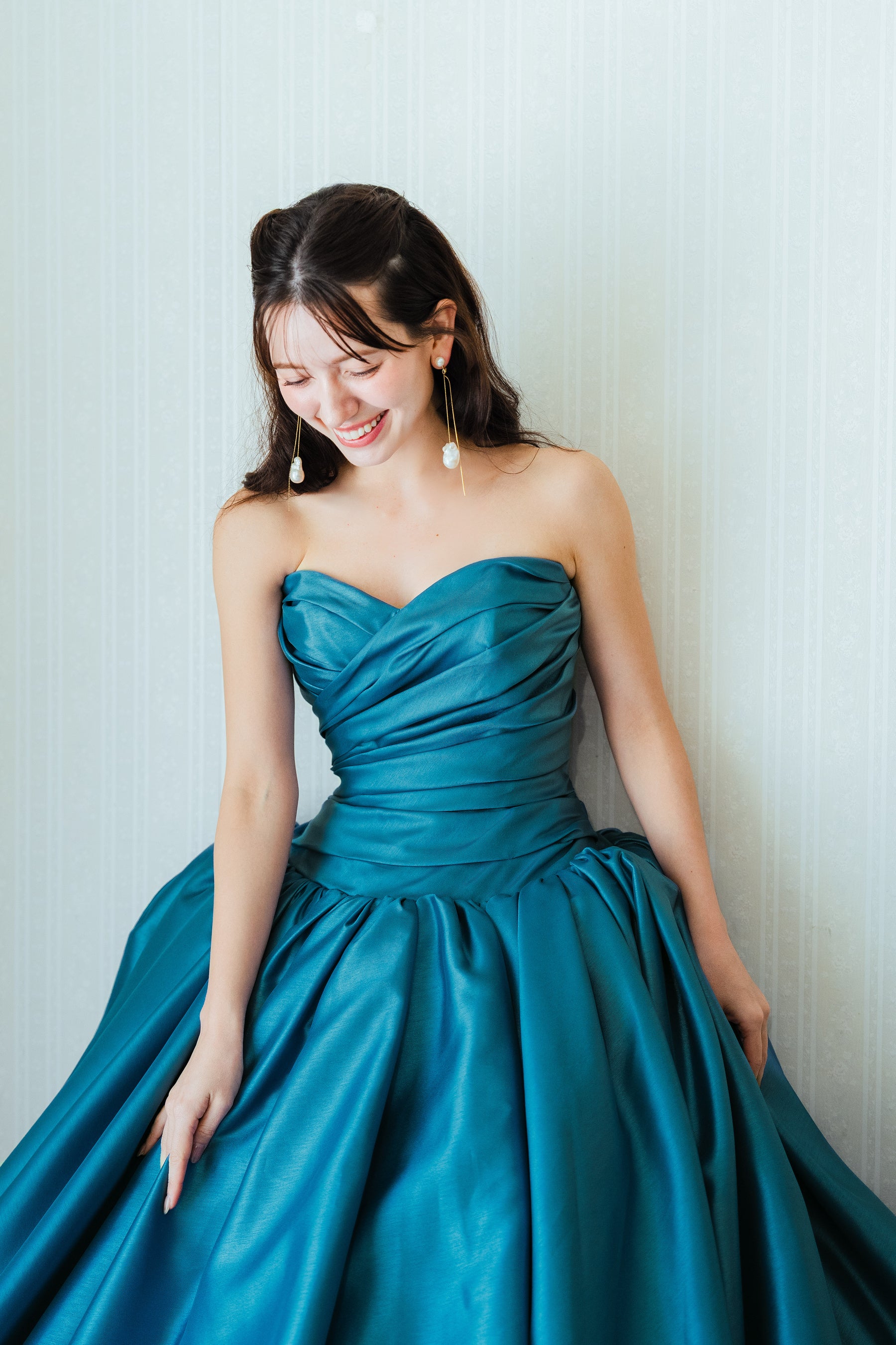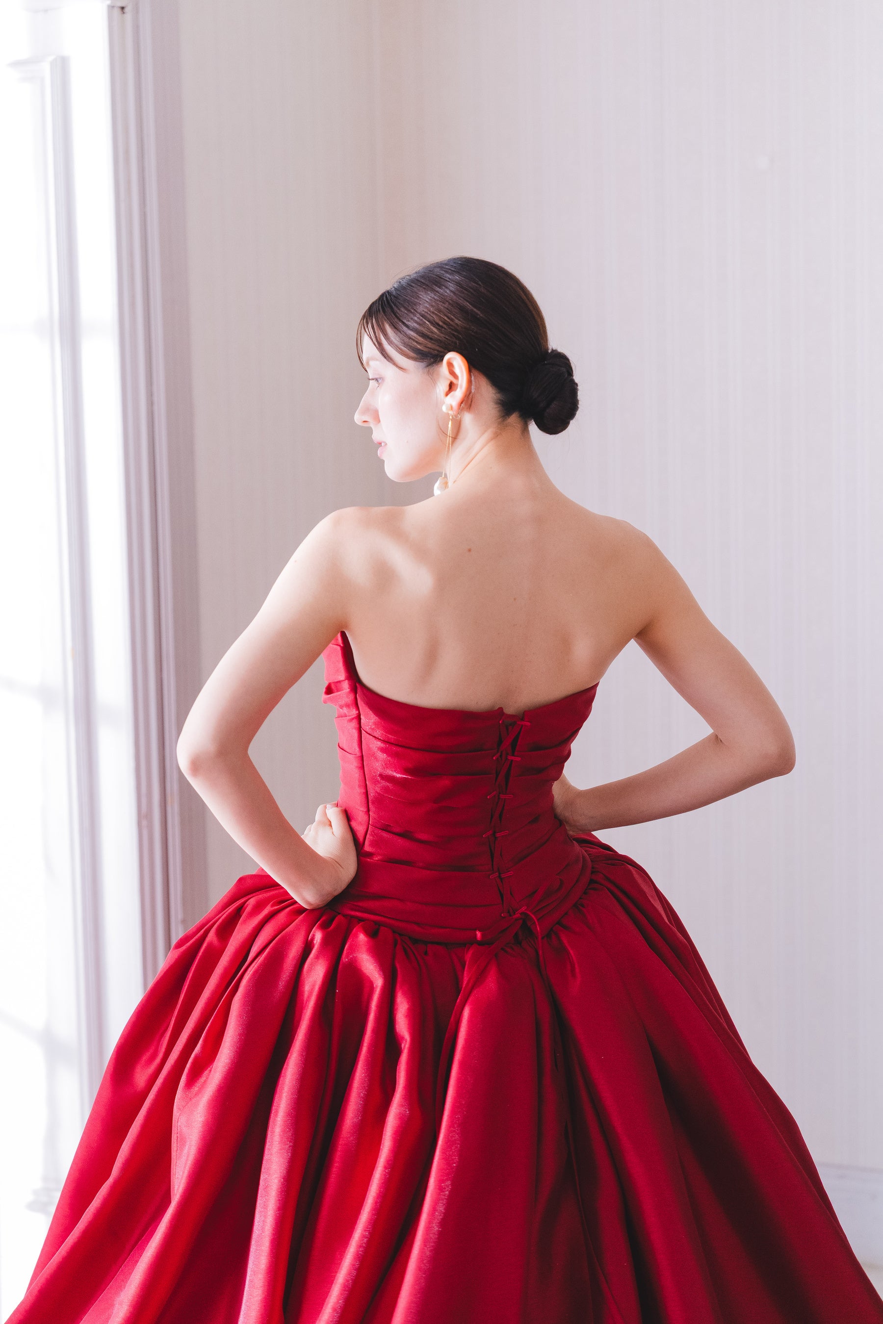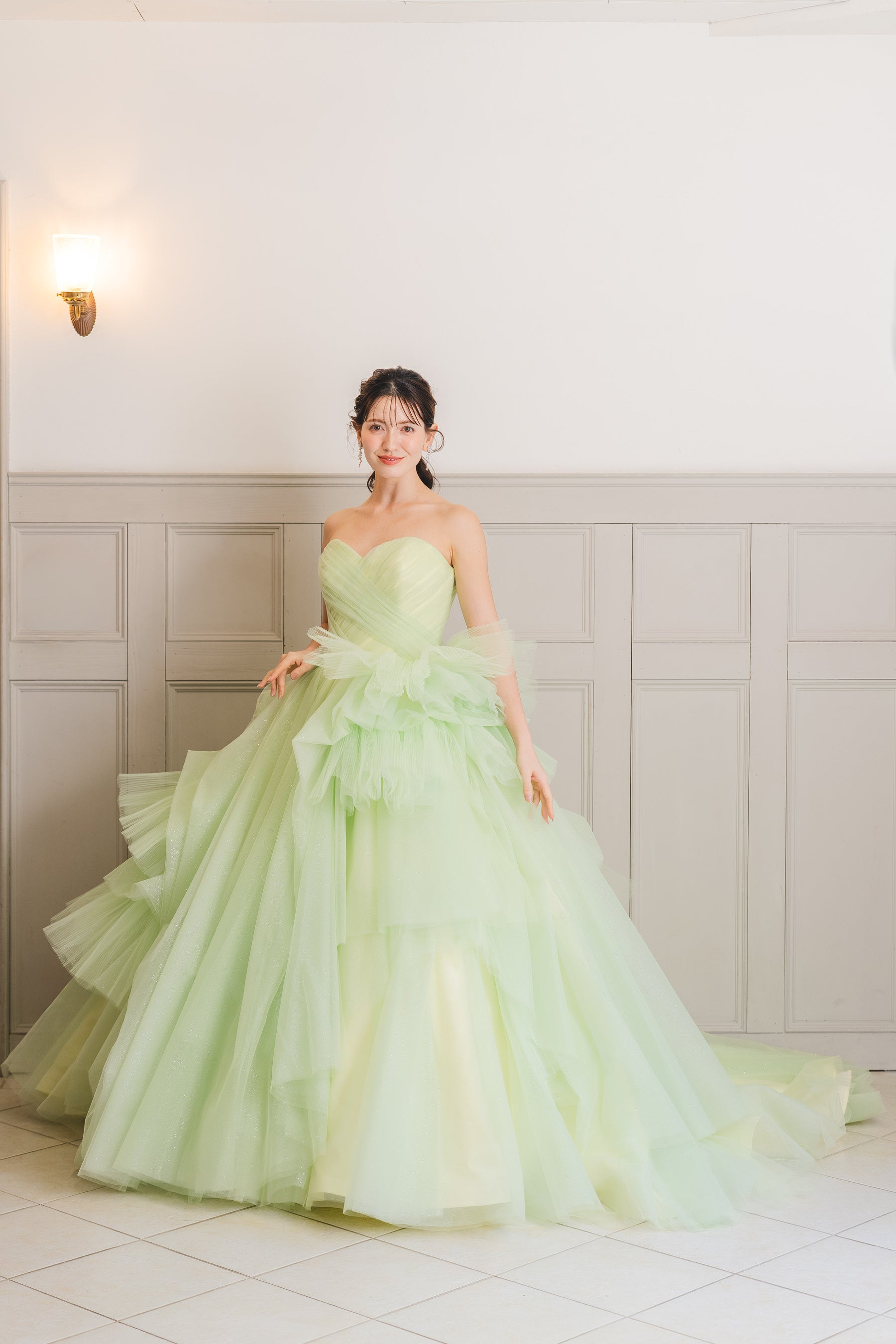 ビスチェ部分は、繊細なタック使いで陰影が生まれ、上半身を美しく魅せるデザインとなっています。