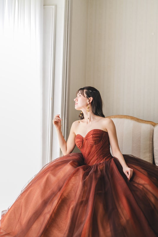 複数の色味を取り入れることによって、より深みのあるオレンジが目を引くドレス。