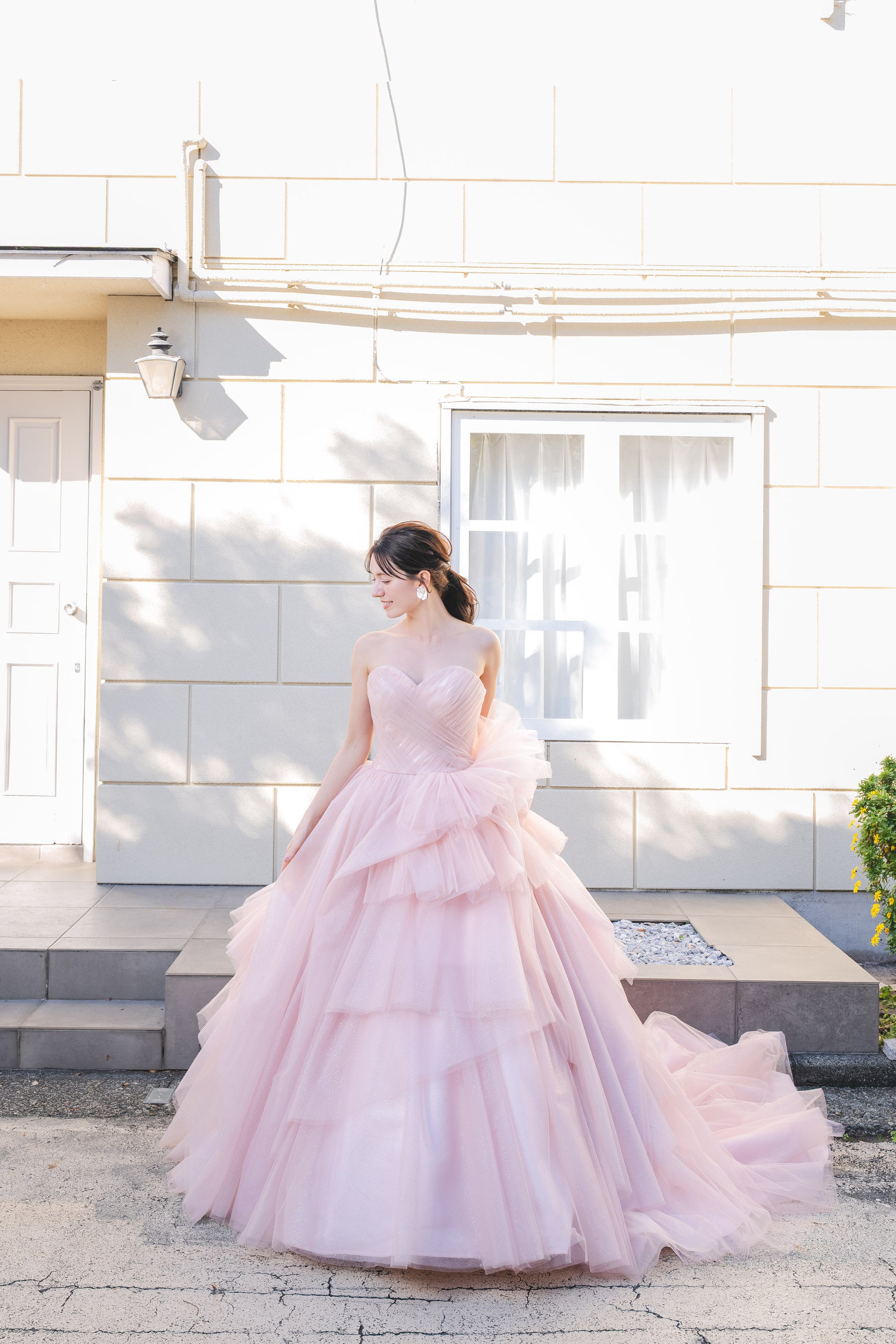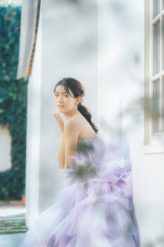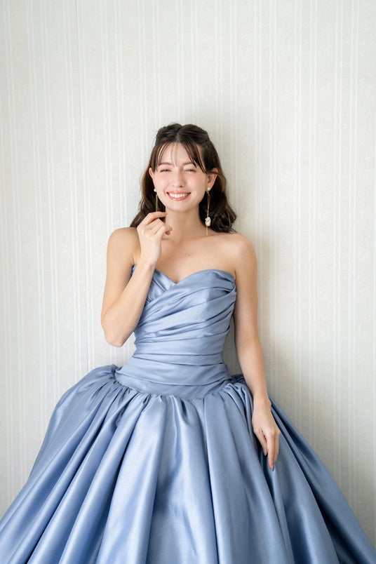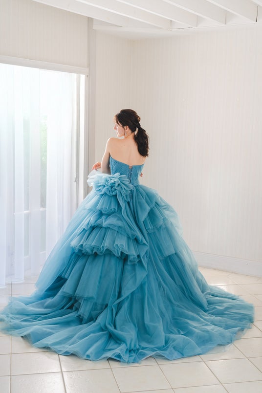 爽やかなブルーのデニム生地でありつつ、カジュアルすぎず、かたすぎないバランスが魅力的。ご挙式はもちろん、前撮りやパーティにもぴったりのスタイルです。