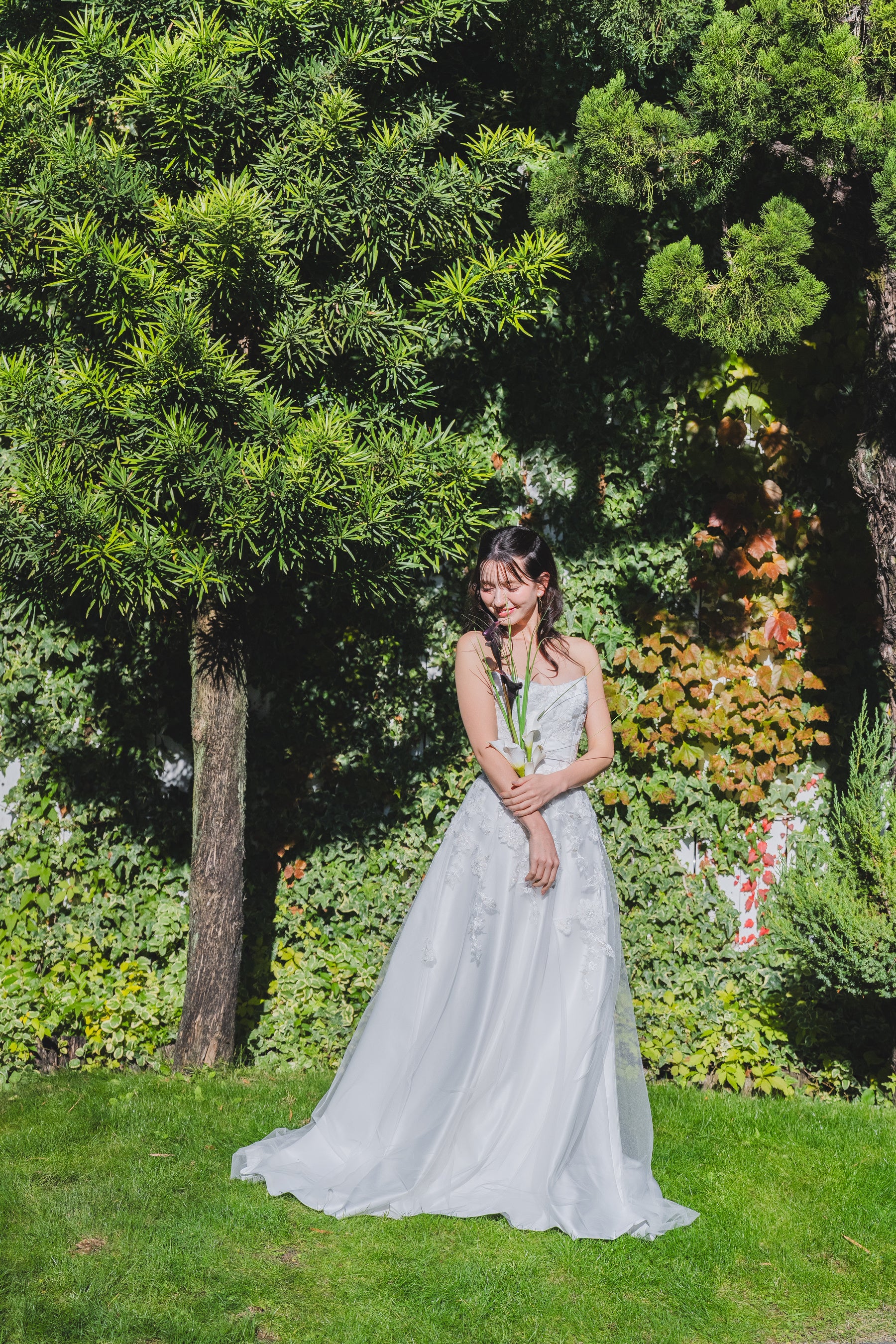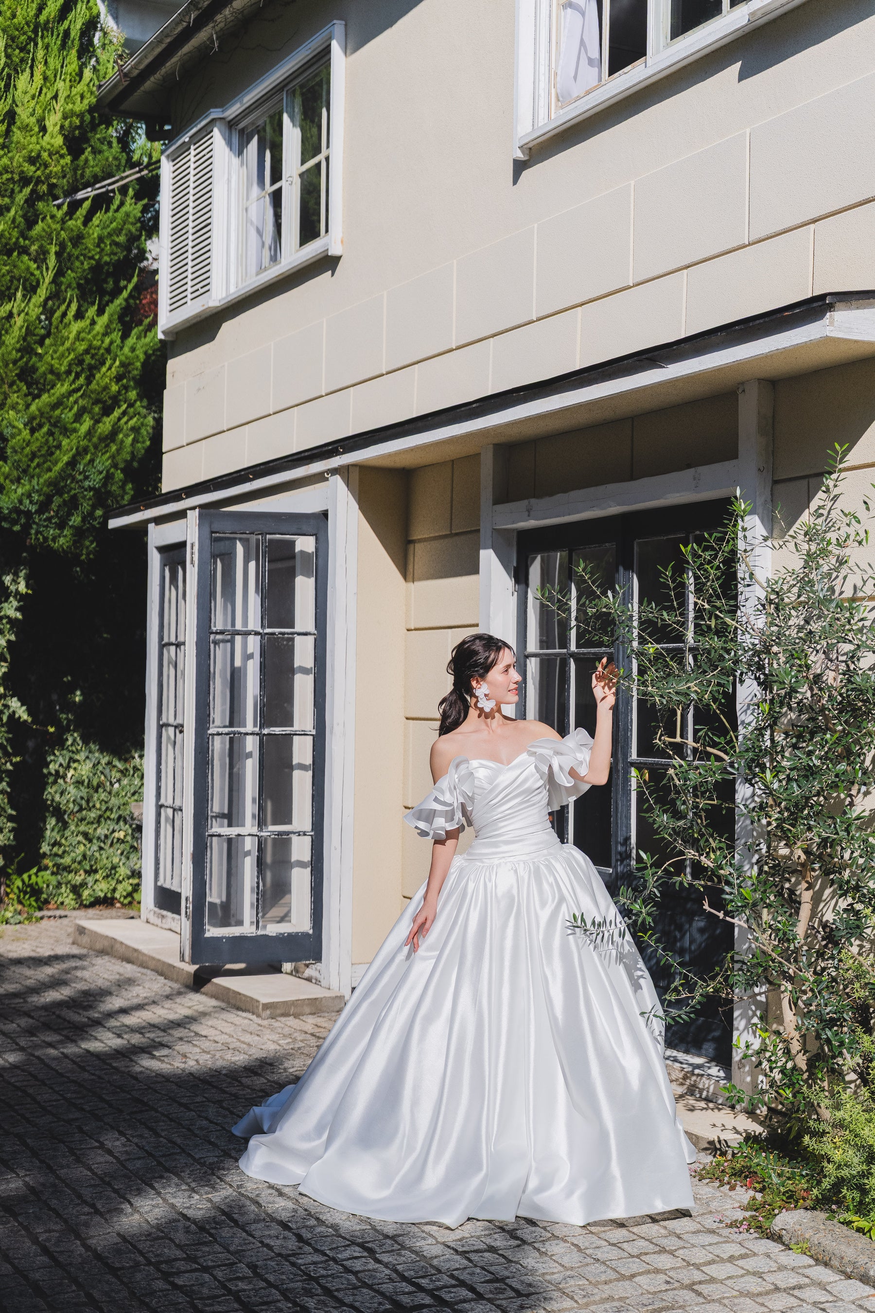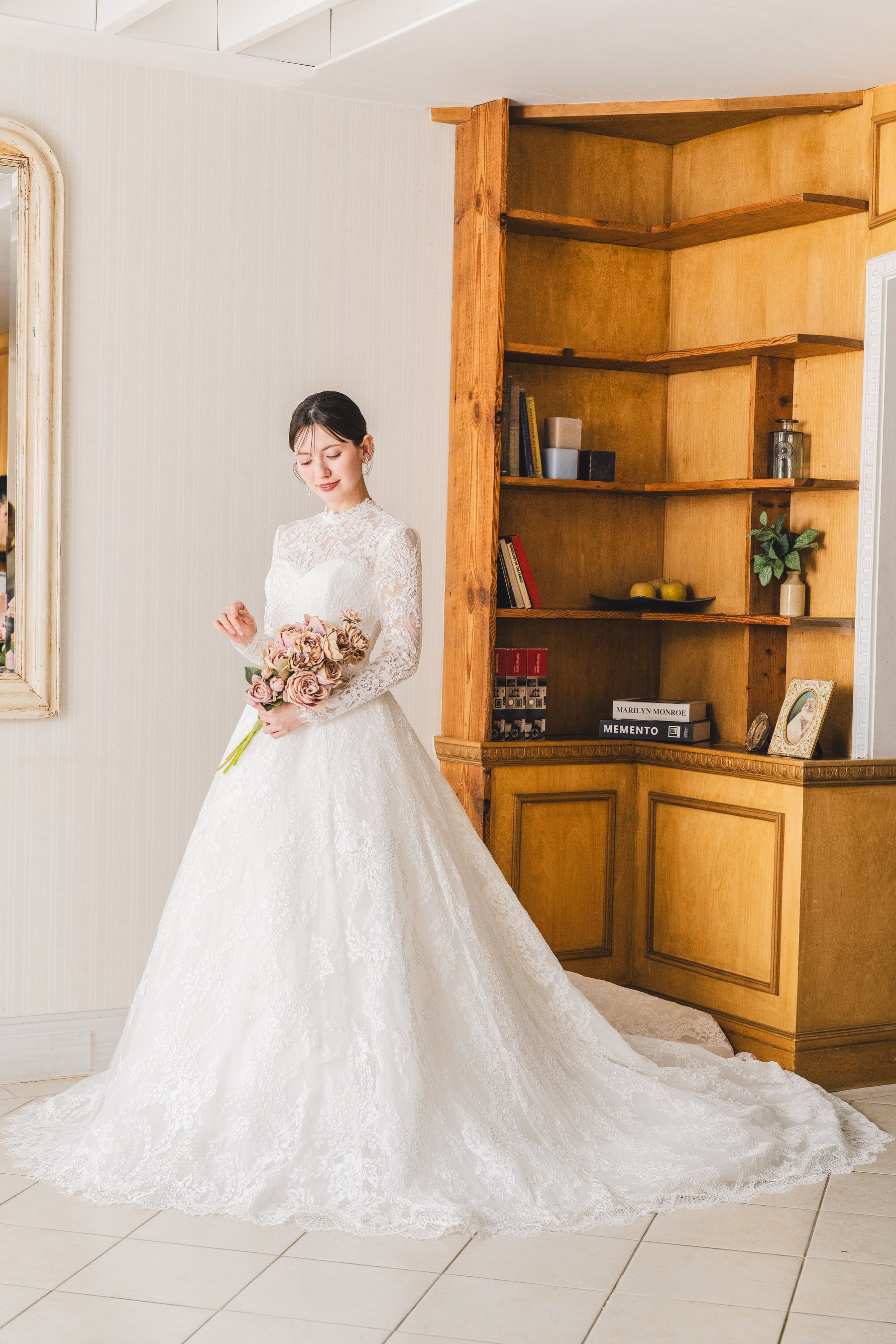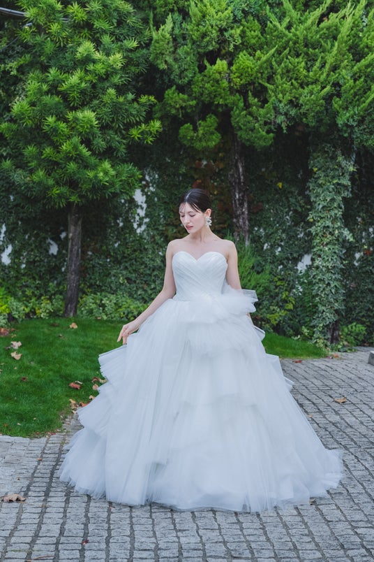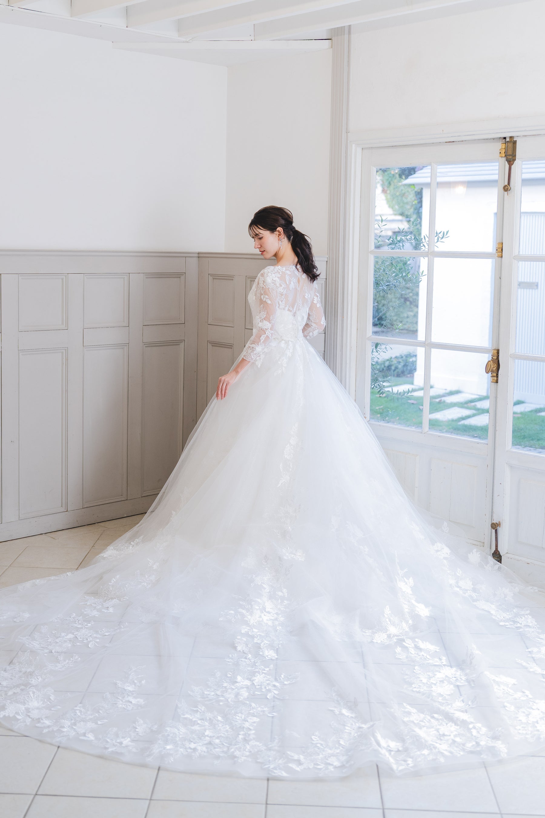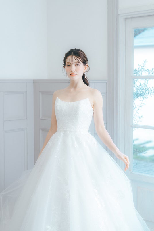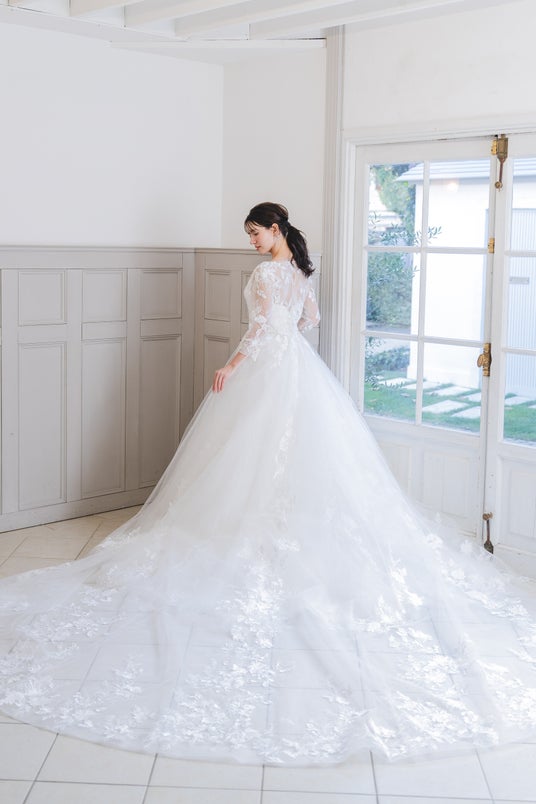 繊細なレースと上質な生地が美しく調和したプリンセスラインドレスです。華やかなロングトレーンが存在感を放ち、バックスタイルも美しく見せてくれるフォトジェニックなデザインとなっています。