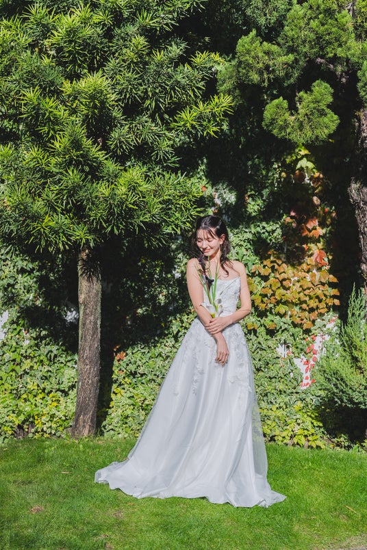 レースが優しくあしらわれ、動くたびに柔らかく光を受けて輝くデザインのドレスです。歩くたびにスカートがふんわり揺れ動き、清楚で優しい雰囲気に。軽やかに、美しく、洗練された一着となっています。