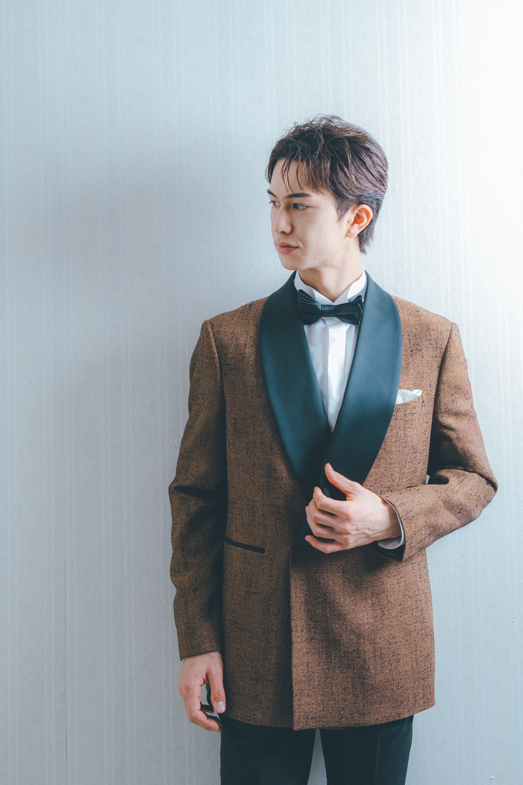 深みのあるブラウンに細かなテクスチャーが施された、落ち着きと個性を兼ね備えたタキシード。大きくカーブを描くブラックのショールカラーが、クラシックな雰囲気を引き立てながらも、全体をシャープにまとめています。