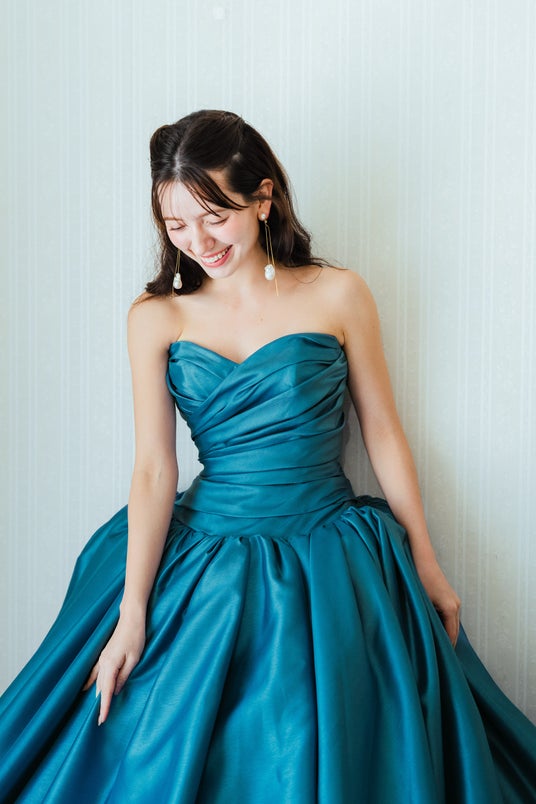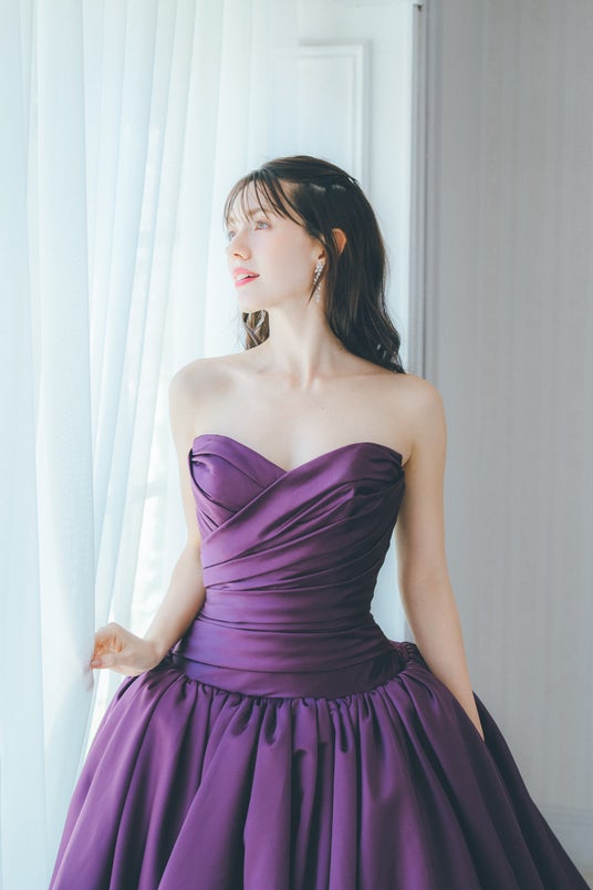 上品な光沢を放つサテン生地で、シンプルなデザインの中に美しさが伝わるドレス。胸元はハートカットで優美なラインを描き、ウエストには細かなタックを寄せることで、程よい立体感と美しいシルエットを実現しました。