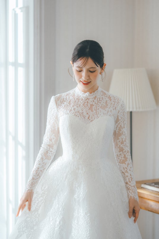 贅沢に360°レースを使用した、優雅で格式高いデザインが印象的なドレス。高めのネックラインはよりクラシカルで上品さを演出し、思わず目を奪われるような優雅なデザインに仕上げています。