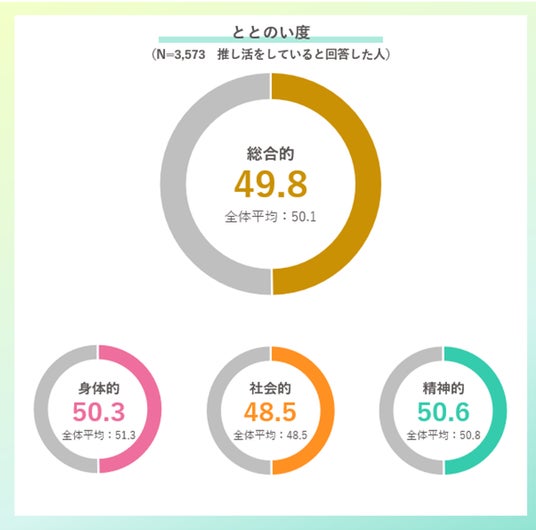 推し活をしている人を対象に、幸福度を表す「ととのい度*」を算出し、全体との比較を行った。精神的ととのい度、身体的ととのい度、社会的ととのい度、さらに3つの総合的ととのい度をそれぞれ算出した。推し活をしている人の総合的ととのい度は49.8点で、推し活をしていない人を含む全体平均の50.1点に近い点数となった。要素別の3つのととのい度を見ると、精神的ととのい度が最も高く50.6点だった。次いで、身体的ととのい度が50.3点、社会的ととのい度が48.5点だった。精神的・身体的ととのい度は全体平均よりも低く、社会的ととのい度は全体平均と同じ点数となった。推しているジャンル別に総合的ととのい度を比較すると、「テーマパーク・エンタメ施設」を推している人が最も高く、51.5点となった。「スポーツ選手」推しと「乗り物」推しは、他のジャンルと比較し、身体的ととのい度が高くなる傾向が見られ、それぞれ52.0点、51.8点となった。